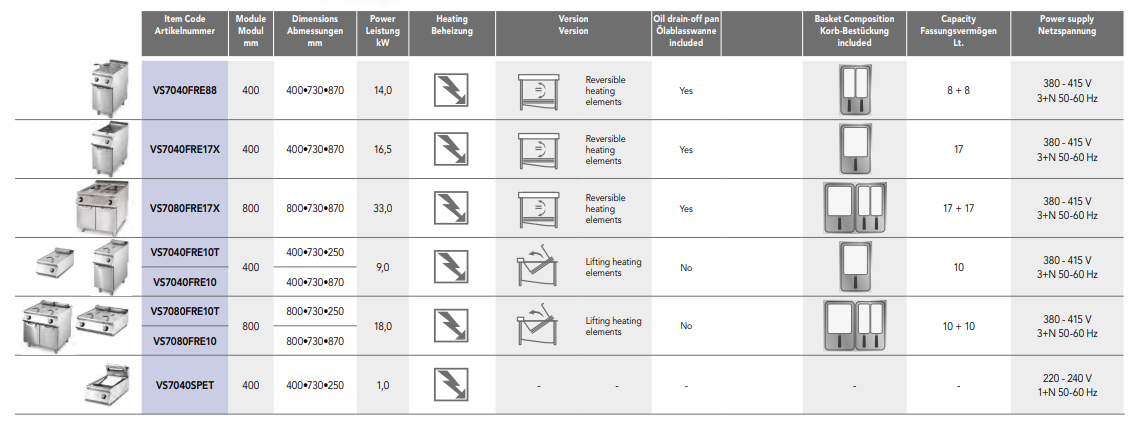 - Die elektrischen Fritteusen der Serie 700 sind in Modellen mit einem oder zwei Kesseln erhältlich. Es gibt zwei Versionen: Mit drehbaren Heizelementen oder abnehmbaren Heizelementen für die Stromversorgung.