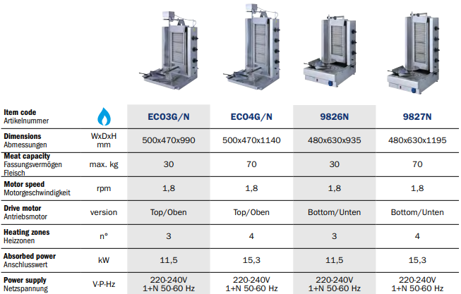 Zur Auswahl stehen Modelle mit Motorantrieb oben oder unten. Unabhängig vom Motorantrieb sind alle Modelle mit Einzelbrennern ausgestattet, welche individuell einstellbar sind. Das maximale Fleischgewicht ist abhängig vom Modell und reicht von 35 bis 85 kg.