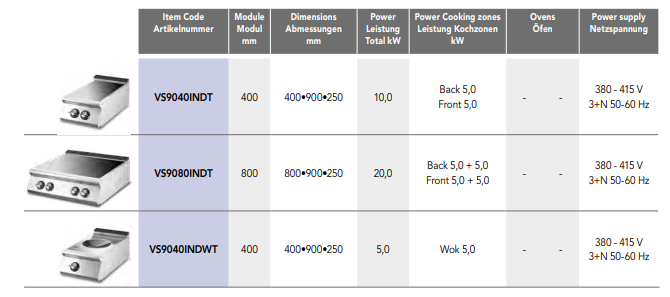 - Induktionsherde sind die ideale Lösung für alle, die in kurzer Zeit hohe Effizienz und einfache Reinigung wünschen. Sie sind mit 2 oder 4 Kochzonen mit jeweils 5 kW Leistung sowie in einer Wok-Version mit einer Zone erhältlich.