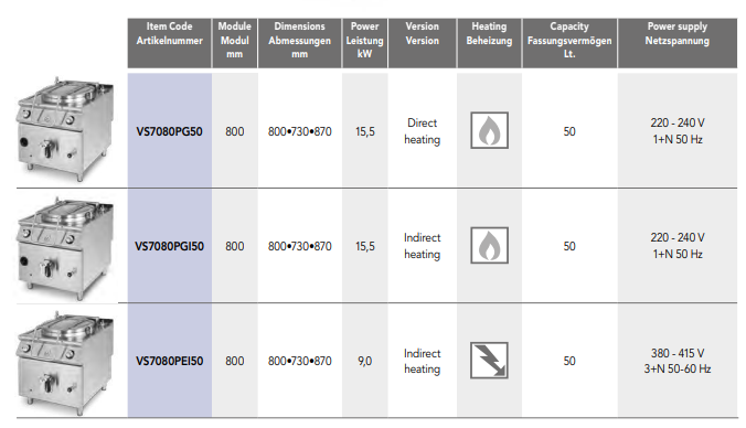 - Kochtöpfe – Serie 700 sind in gasbetriebenen Modellen mit direkten und indirekten Heizoptionen sowie in elektrischen Modellen mit ausschließlich indirekter Heizung erhältlich.