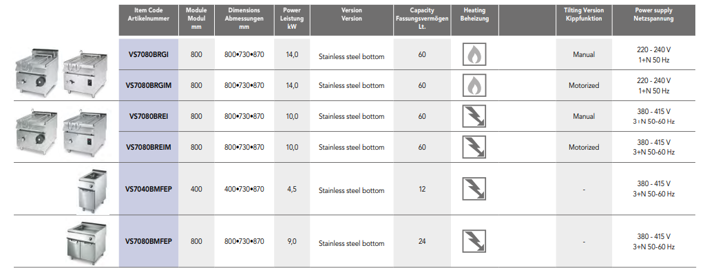- Stapelbare und multifunktionale Pfannen – Serie 700 sind in gas- und elektrischen Versionen erhältlich. Beide Versionen bieten sowohl motorisierte als auch manuelle Kippmodelle.